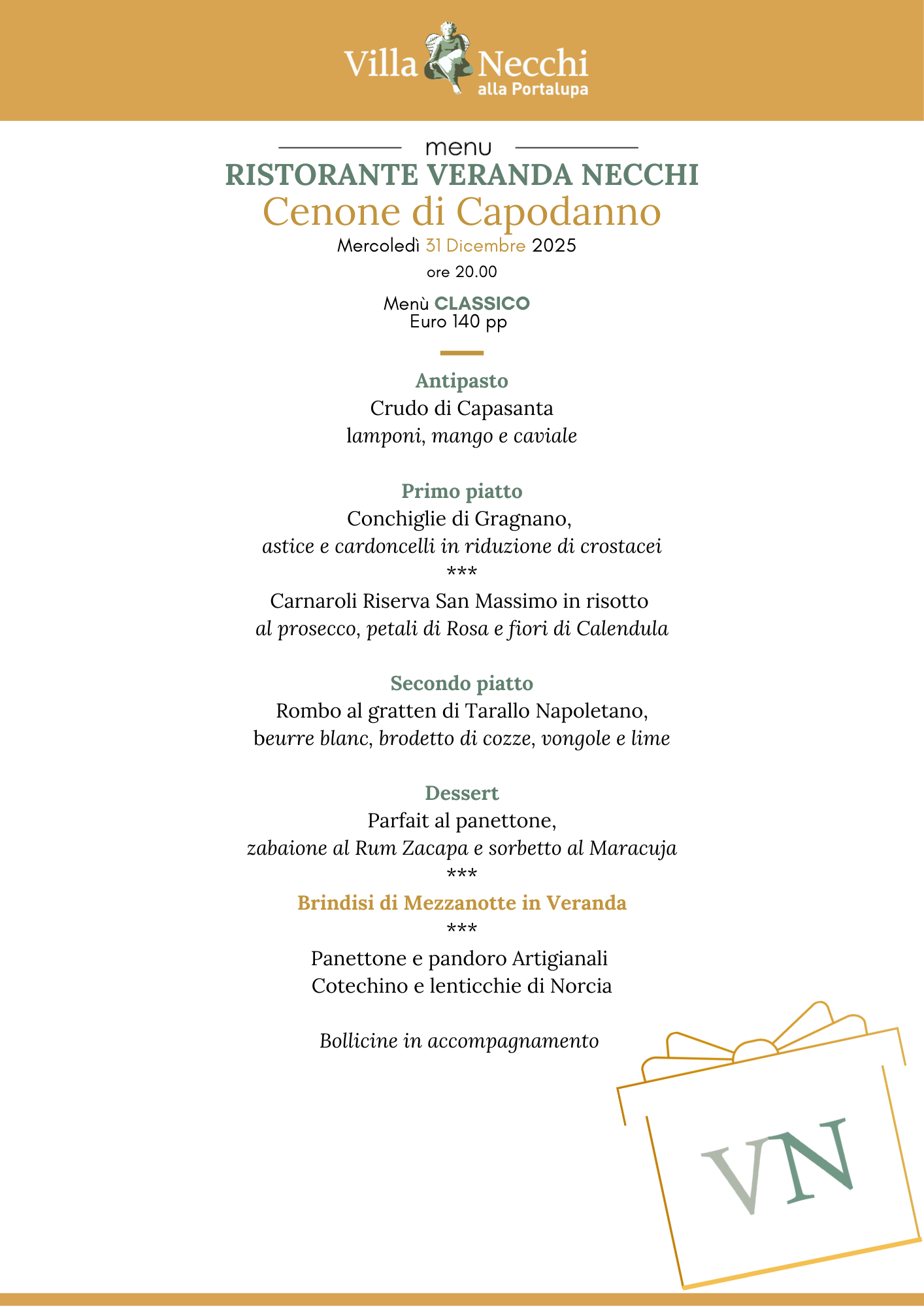 Verrete accolti dalle ore 20.00 nella Veranda della Villa per iniziare la serata con un aperitivo.